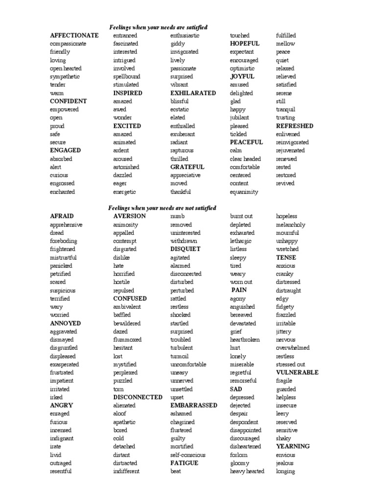 Feelings when your needs are satisfied AFFECTIONATE compassionate friendly loving open hearted sympathetic tender warm CONFIDENT empowered open proud safe. Challenge yourself to get specific about your feelings and notice the impact on your self-connection and connection to others. Our aim is to identify name.